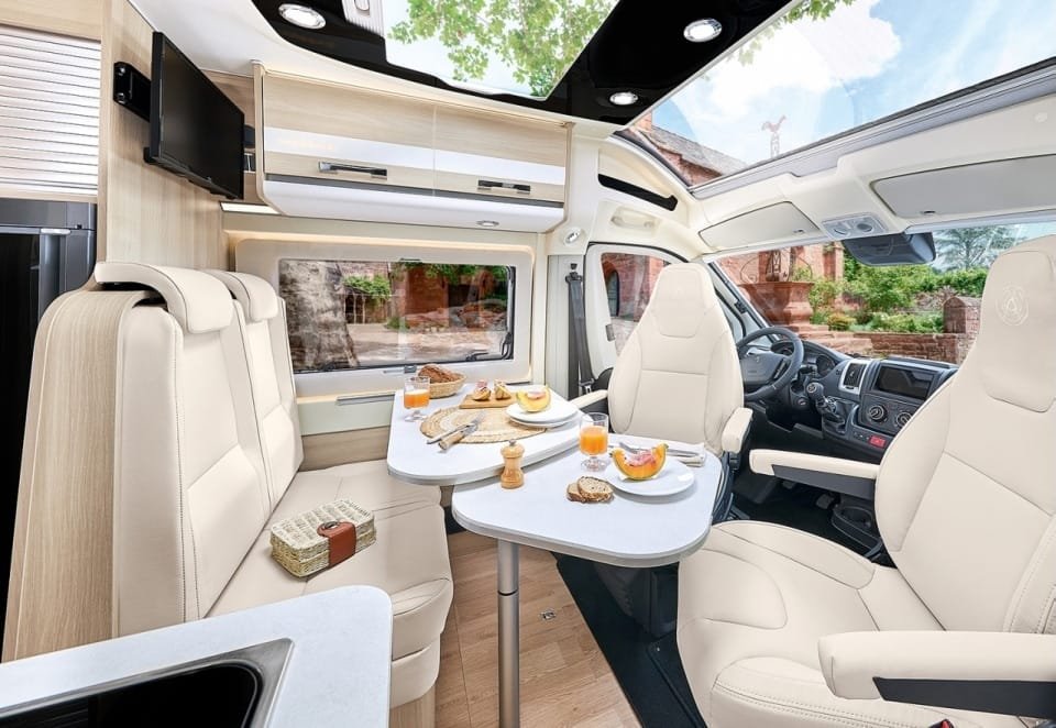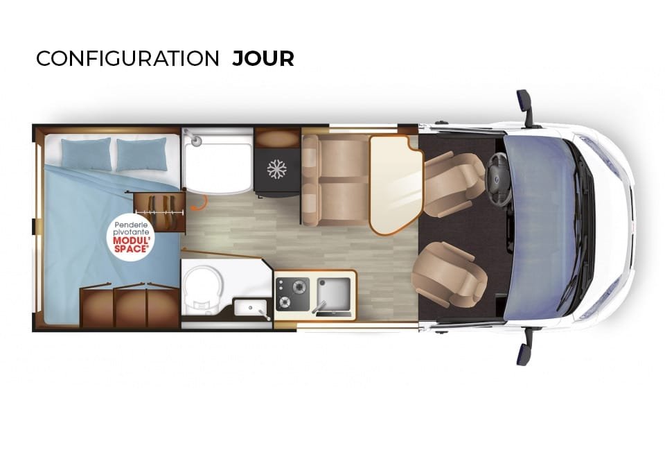 Ce modèle est doté d’une cuisine entièrement équipée avec réfrigérateur, plaque de cuisson et nombreux rangements. La salle de bain modulable optimise l’espace en combinant douche, WC et lavabo, garantissant un maximum de praticité en voyage. Son chauffage performant et son isolation renforcée assurent un confort optimal, quelle que soit la saison.