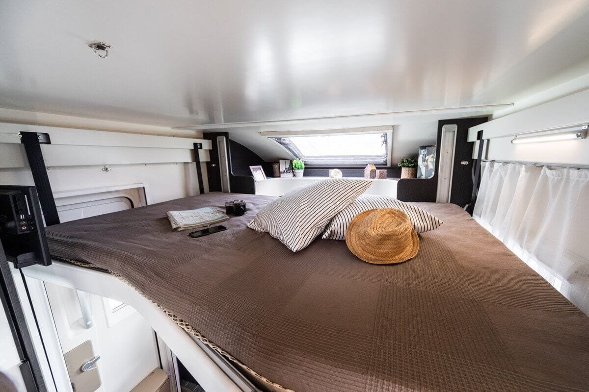 Ce modèle dispose de 4 places homologuées sur route et de 4 couchages, grâce à un lit de pavillon électrique et à la possibilité de convertir le salon en un second couchage.