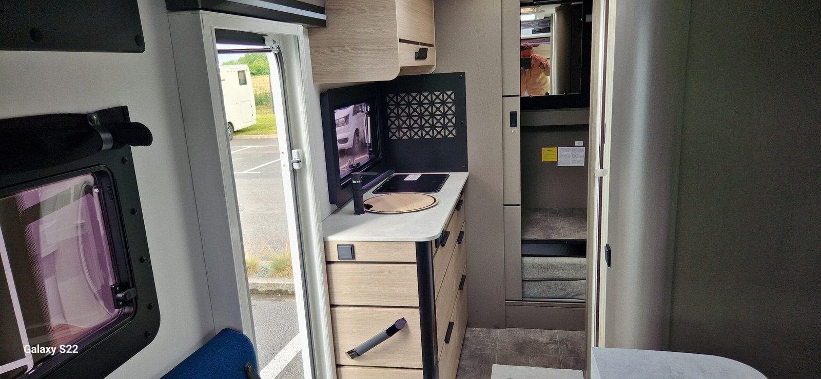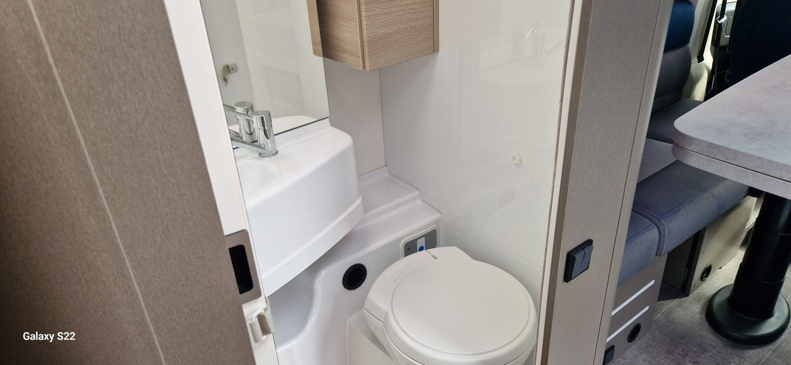 L’intérieur se distingue par un maxi salon lumineux, équipé de banquettes face à face et de sièges cabine pivotants, offrant un espace convivial pour les repas et la détente.