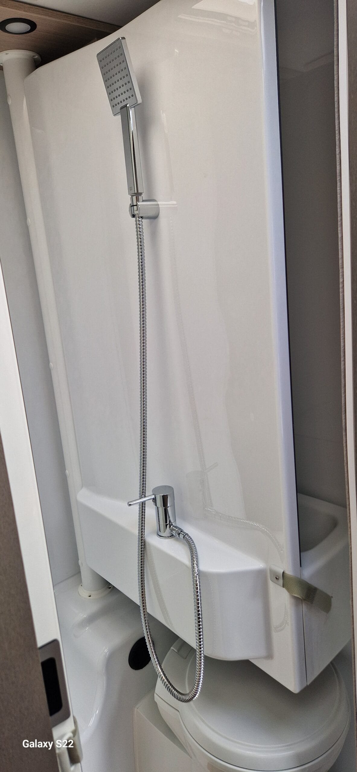 La salle de bain compacte comprend une douche séparée et des toilettes, assurant le confort des occupants lors de leurs voyages.