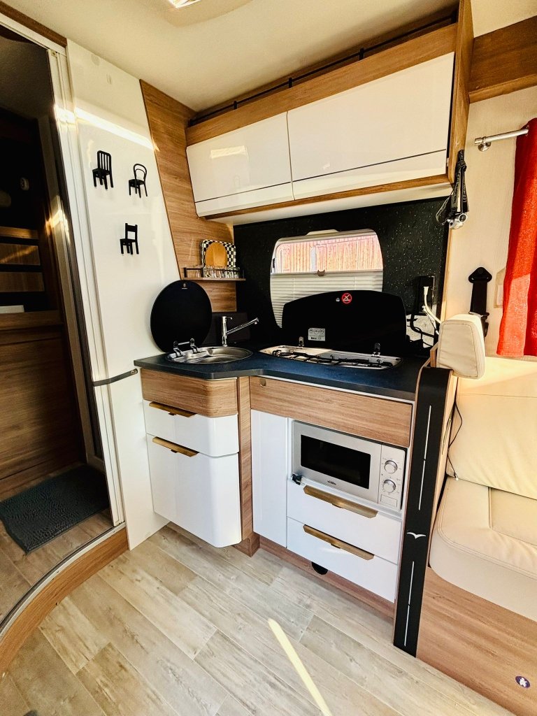 Camping-car tout équipé pour faire du camping sauvage, douche, wc, chauffage, cuisinière, lits, câble pour se brancher sur 220 volts, tuyau pour remplir sa réserve d’eau, indicateur de puissance, climatisation au tableau de bord, chaises, table.